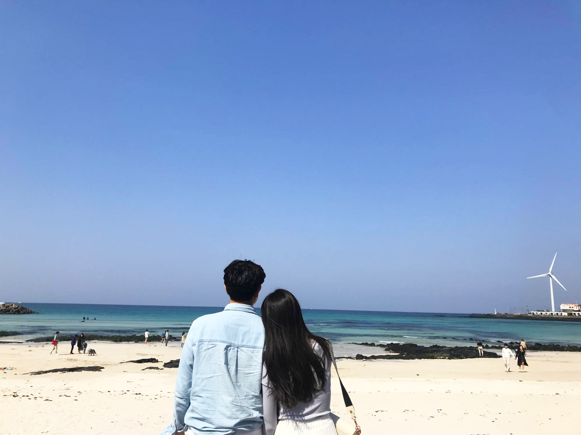 남편과 함께찍은 커플샷! '월정리'에는 바람개비같은 '풍차'들이 많아서 제주도의 바다를 더욱 아름답게 해주는것 같아요. 이날 날씨도 너무 좋아서 해변 산책하기에 참 좋더라구요. 월정리해변 가시면 모래사장에서 꼭 산책해보세용.